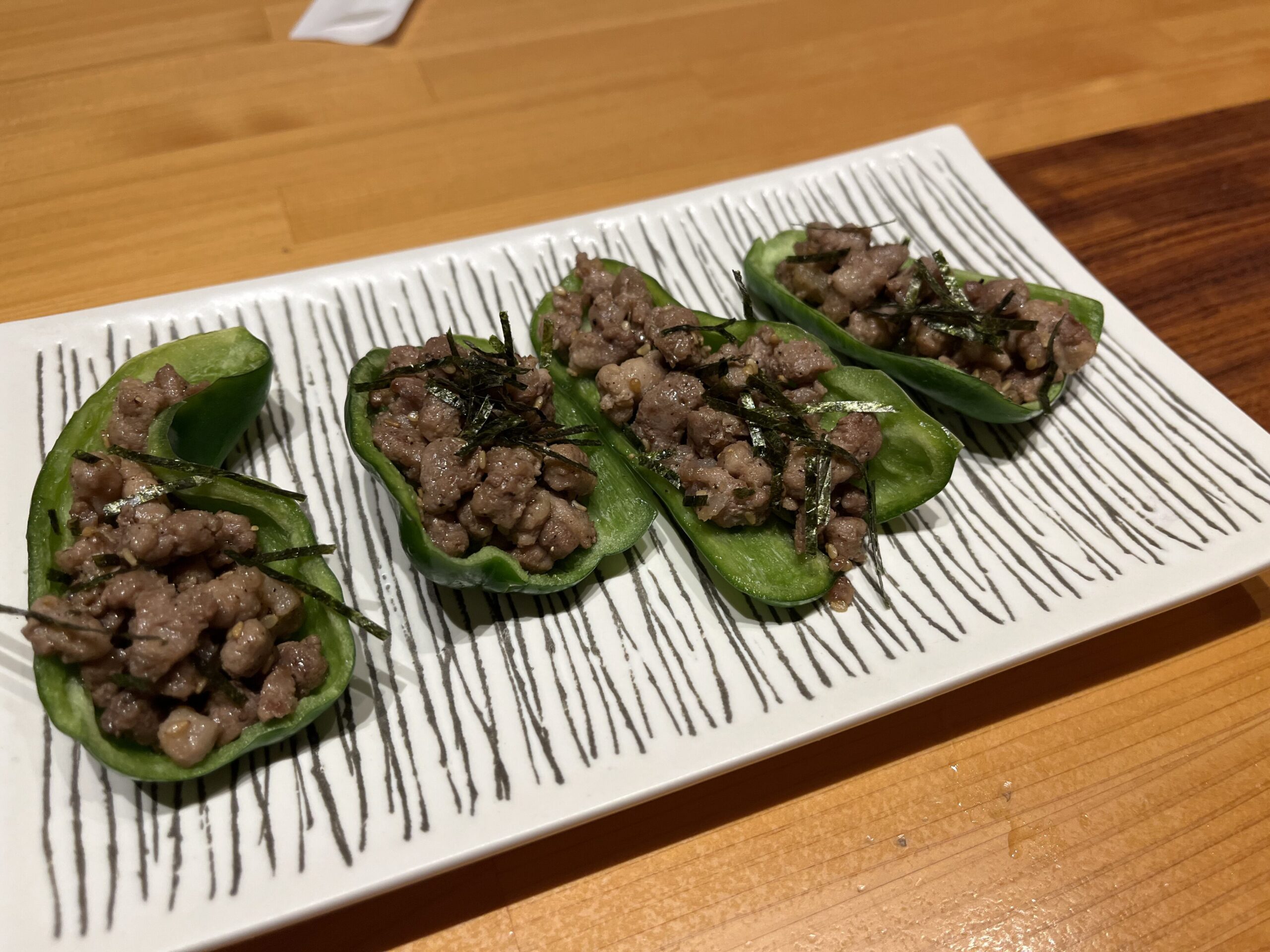 まず「生ピーマンの肉詰め」が衝撃!ピーマンがシャキシャキで新鮮、めちゃくちゃ美味しかった。